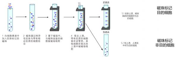 磁珠分選使用磁珠偶聯(lián)的抗體去標(biāo)記細(xì)胞,然后把標(biāo)記好的細(xì)胞懸液置于磁場中,帶磁珠的細(xì)胞就留在試管里,不帶磁珠的細(xì)胞在上清中,從而實(shí)現(xiàn)分選。